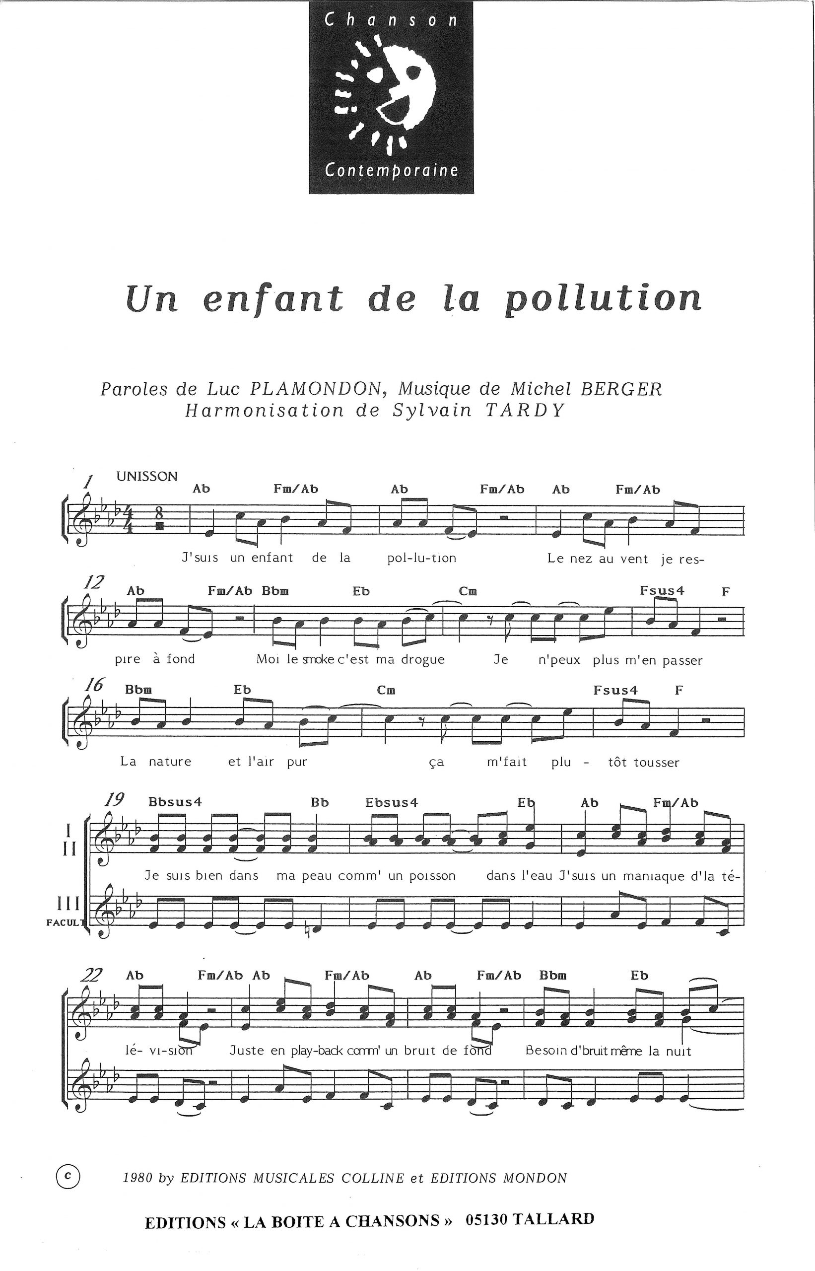 Paroles et musique de PLAMONDON/BERGER Harmonisation : Sylvain TARDY