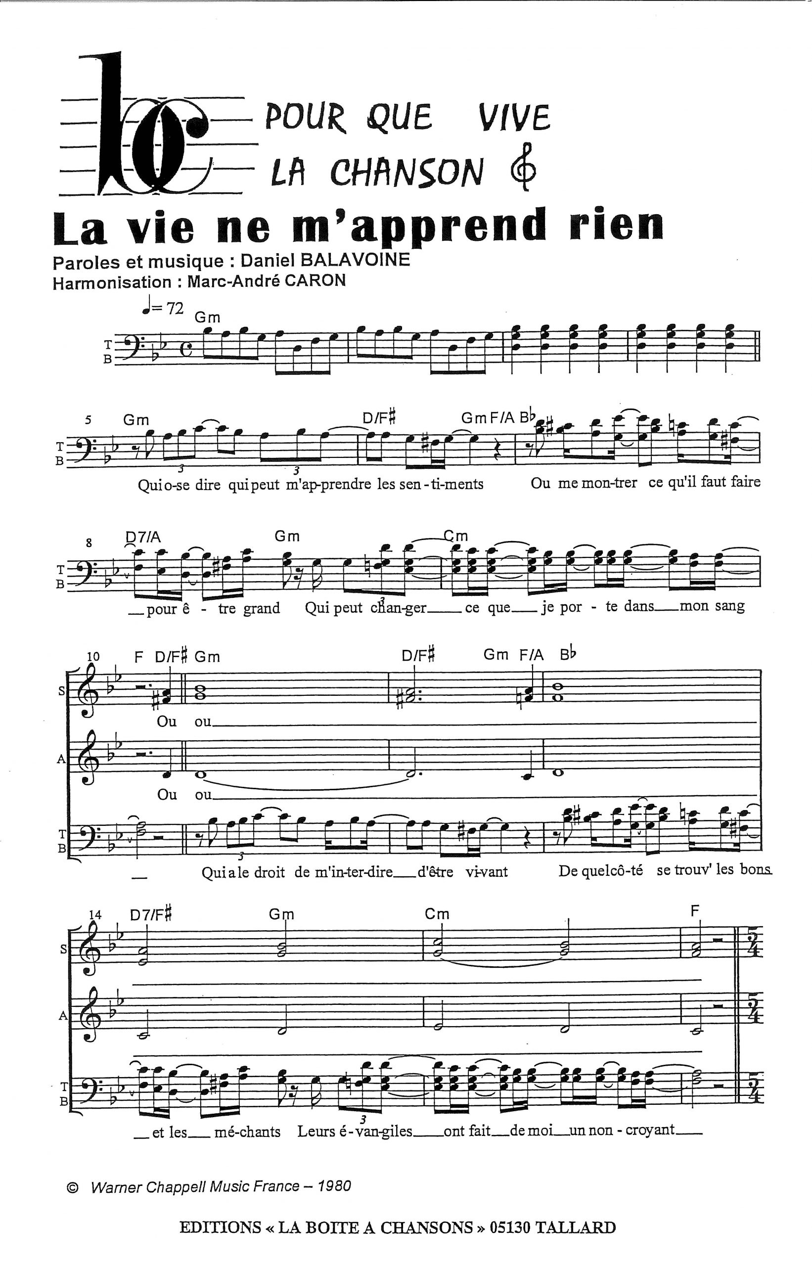 Paroles et musique de BALAVOINE Harmonisation : Marc André CARON
