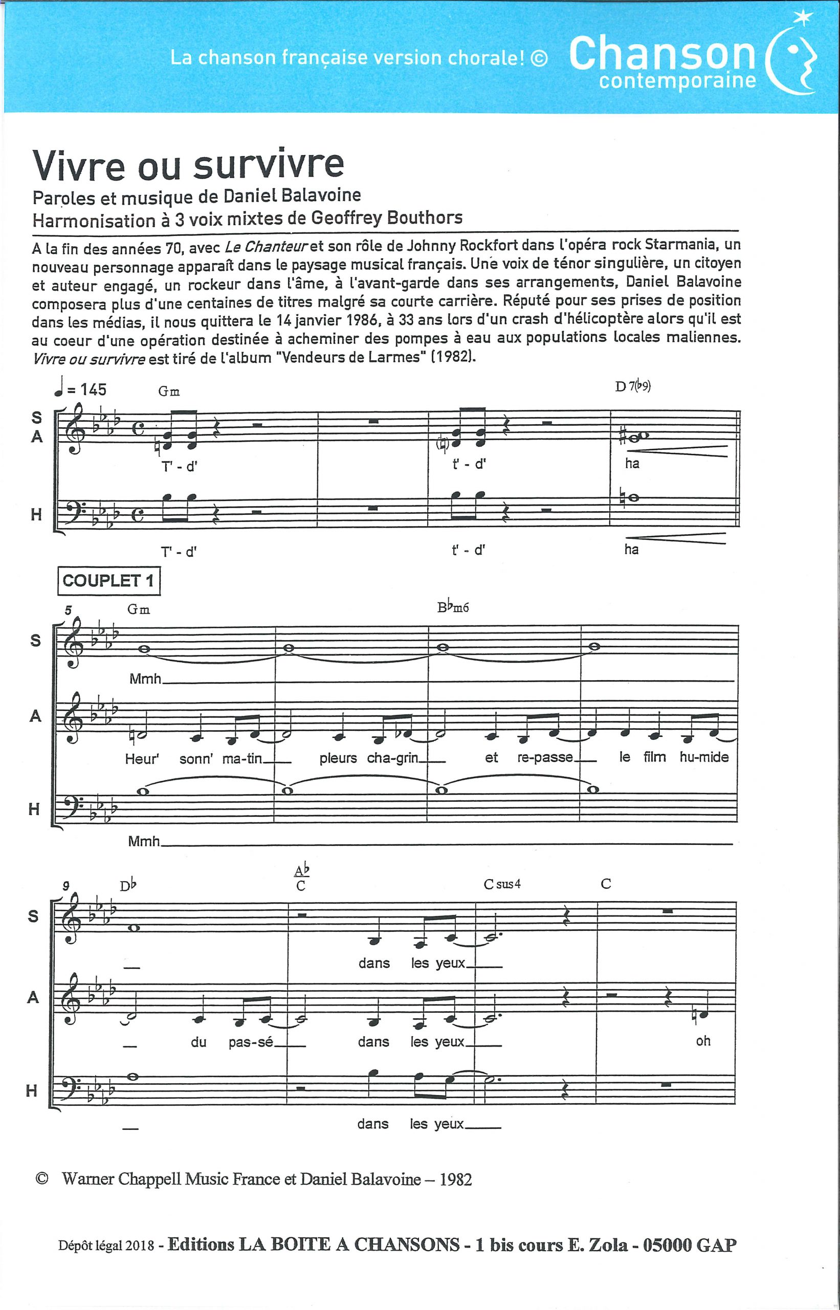 Paroles et musique : D. Balavoine Harmonisation : Geoffrey Bouthors